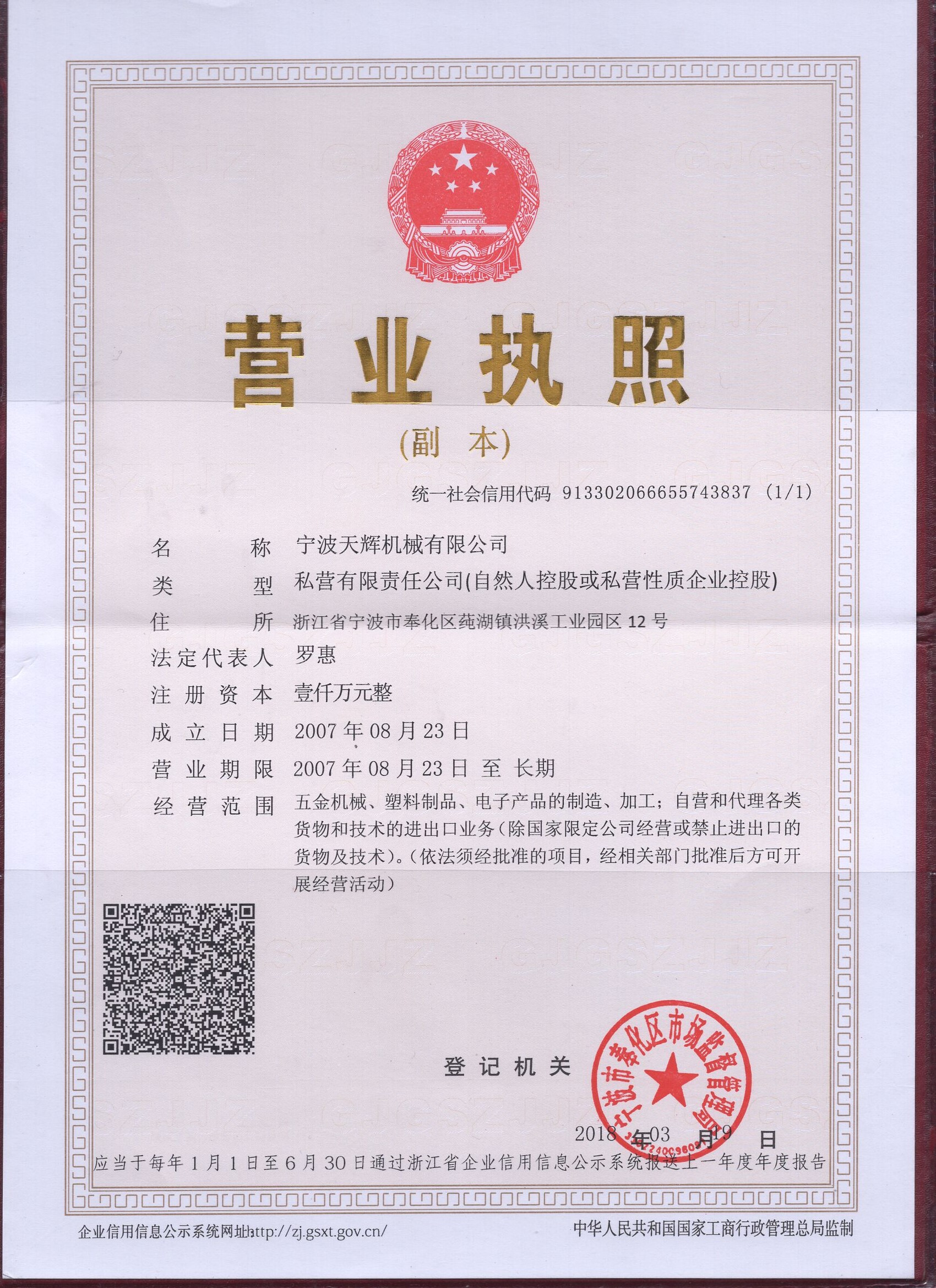 天輝機械公司在飛速的發展。目前的生產場地已不夠用。公司老總在奉化購買了10畝土地,重新裝修,將于2018年6月20日搬遷。目前公司的注冊資金已增至1000萬人民幣。