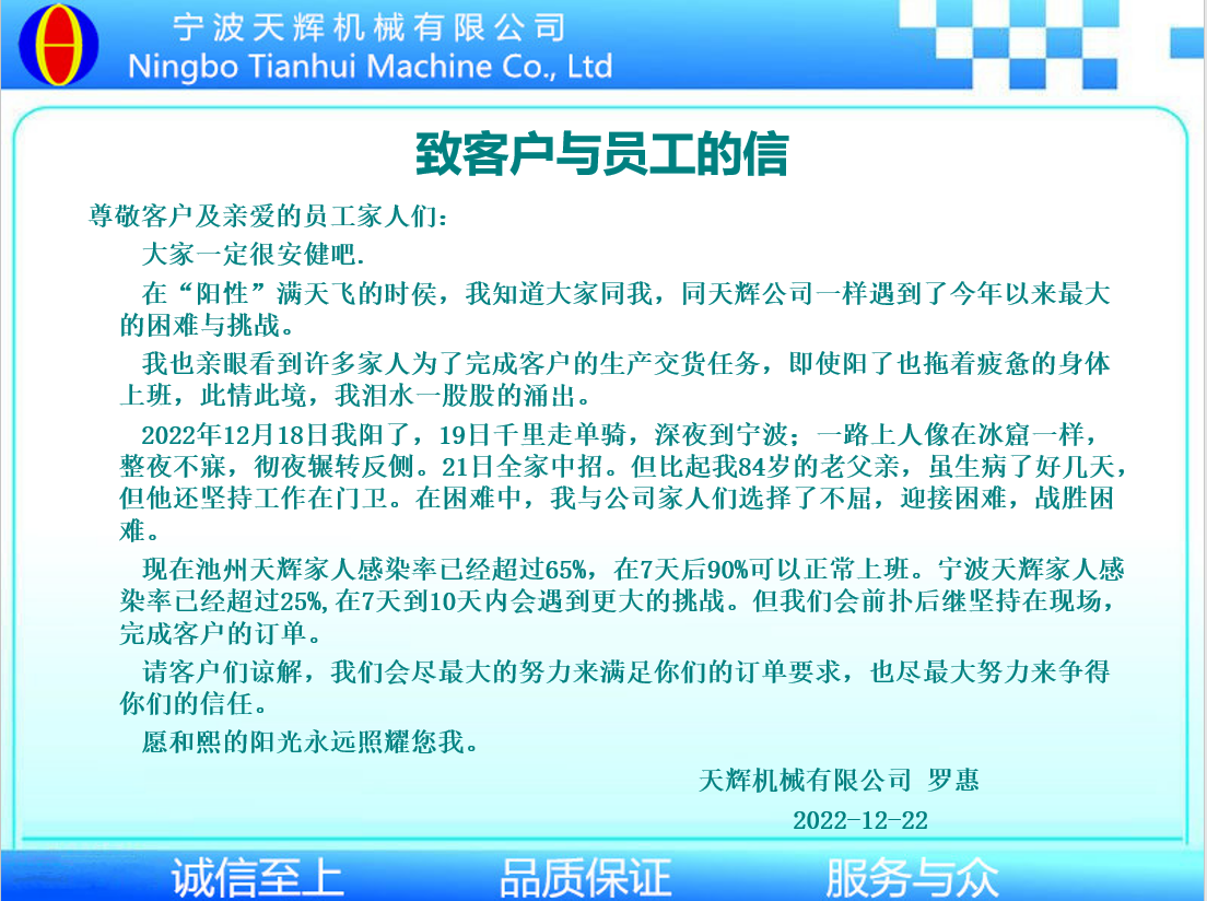 對于生產(chǎn)精密機械零件的生產(chǎn)企業(yè)來說,年底是趕貨最忙的時候。鑒于目前去全國疫情爆發(fā),天輝公司總經(jīng)理特致信給客戶和員工。對于訂單延誤,我們很抱歉,后續(xù)待員工康復返工將盡最大努力去趕生產(chǎn)進度發(fā)貨。對于天輝的家人們的堅持深表感謝。
